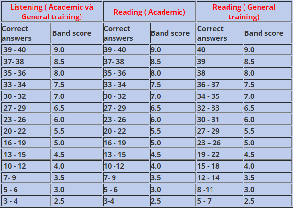 Sau đây là bảng điểm IELTS quy đổi chi tiết cho 2 phần thi Reading và Listening ở cả 2 dạng bài là Academic và General. Các bạn thể đối chiếu để tính điểm cho bản thân một cách dễ dàng hơn: