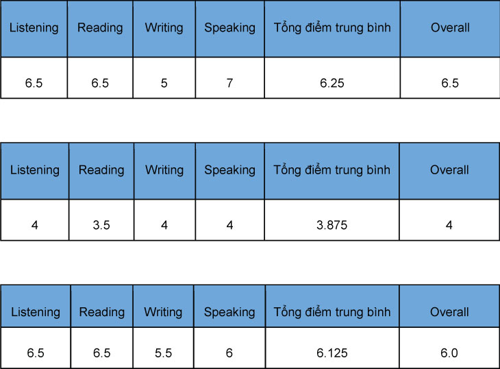 Thí sinh thi IELTS có số điểm như sau: 7.5 (Nghe), 7.0 (Đọc), 6.0 (Viết) và 6.5 (Nói). Điểm Overall của thí sinh này sẽ là 7.0 (27 ÷ 4 = 6.75 = 7.0)